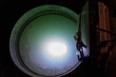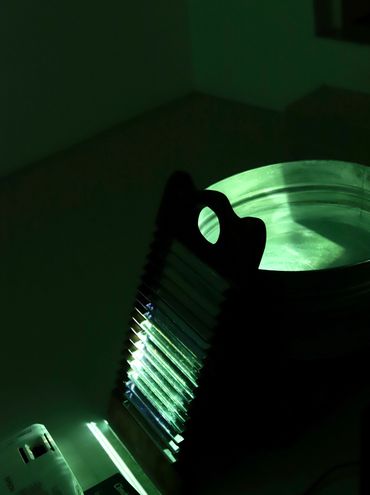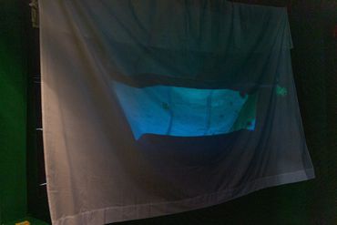 Single channel projection into water, metal washtub, mirrored washboard, powder detergent, bed sheet, clothing line.